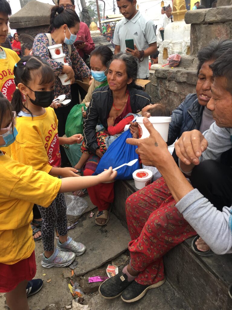 è la distribuzione di pasti preparati al momento a persone disperate e senza tetto e ai loro bambini. Vi chiediamo quindi di aiutarci a proseguire il nostro lavoro a Kathmandu.