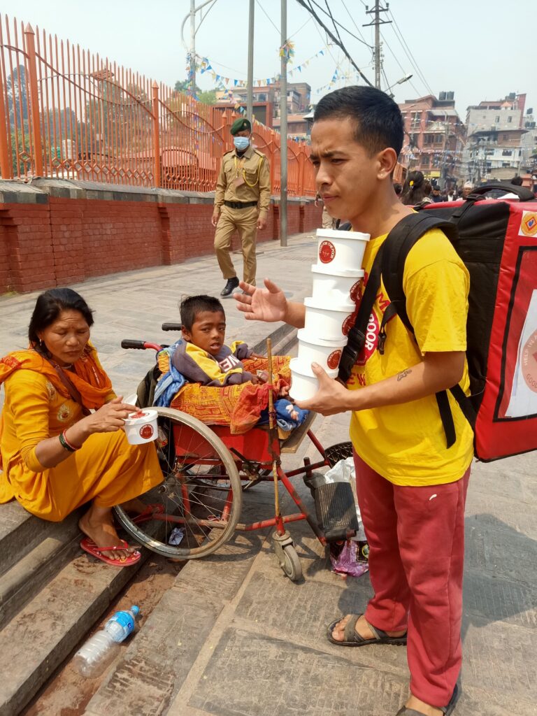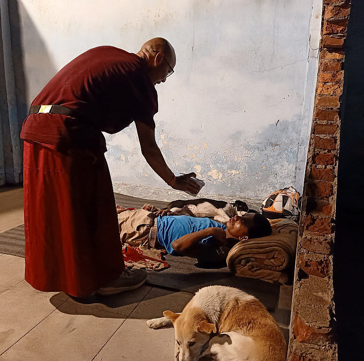 Tibetaanse monnik deelt eten uit in Jorpati, een wijk van Katmandu.