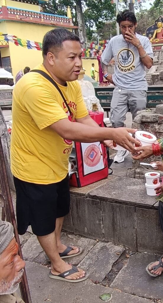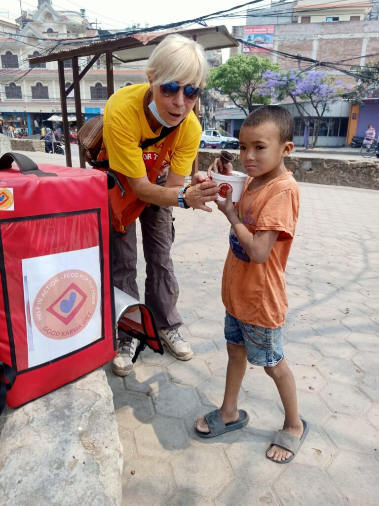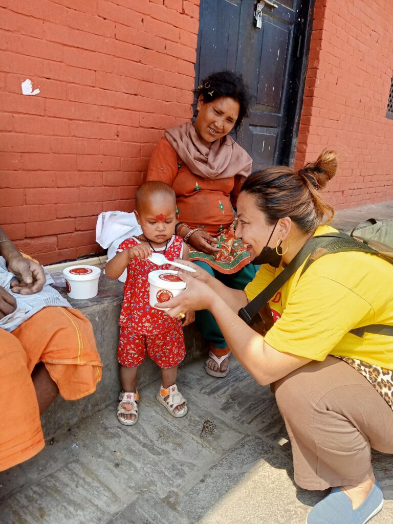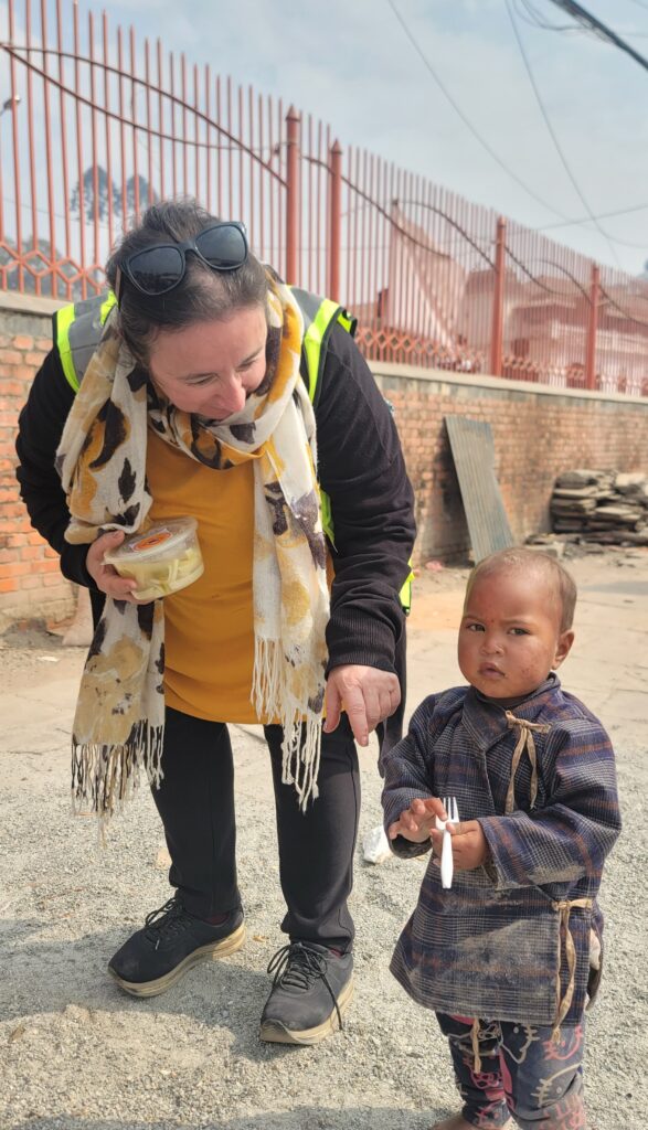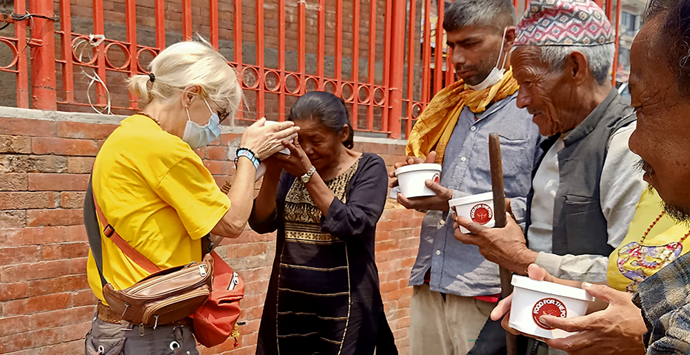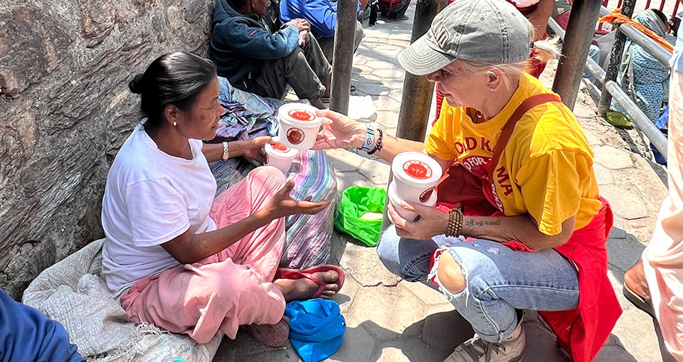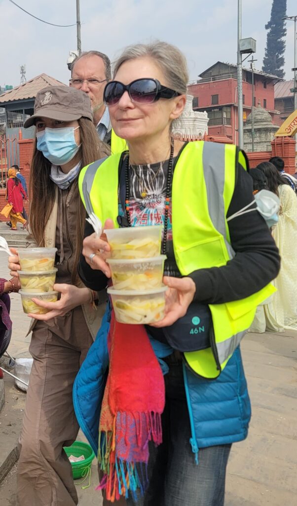 Margy uit Italië is vrijwilliger en deelt 80 maaltijden uit in Pashupatinath